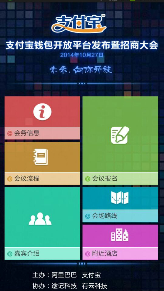 2014年10月27号在深圳招开的支付宝钱包开放平台大会,将传递未来支付宝钱包开放平台想做的事,让未来商业数据化,智能化,让支付这件事不再只是交易的完成,更是服务和商业生态的“开始”。我们有云科技作为此次大会的协办单位,将为此次参会者体验线上和线下怎么完美地结合。这次合作也是支付宝公司对我们在技术,产品开发方面的肯定,我们公司以用户为核心,充分注重用户体验的理念和支付宝公司倡导的是一致的。我们将充分利用这次机会,加深和支付宝公司的深度合作,为用户提供方便,快捷的服务。