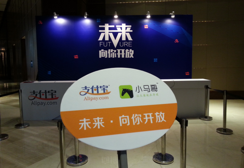 2014年10月27日在广东深圳君悦酒店,“未来 目前,支付宝钱包已经深入了人们的日常生活,便利店、自动售货机、医院、商场、停车场……未来用户能想到的地方,支付宝钱包将会是比现金更方便、安全的支付方式。公元2014年10月27日,支付宝在深圳隆重举办“未来向你开放”大会,全面进军移动支付领域,小马哥作为行业领袖应邀全程参与。