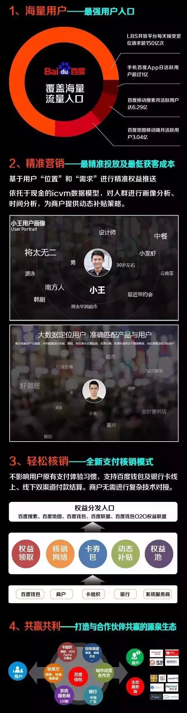 “源泉商业平台”简单说来,是作为专业化供给商+支付服务商+O2O数据营销商这三个角色的综合体,通过百度移动端入口,为线下商户引流,将线下商家的优惠券、打折卡、礼品卡等促销优惠精确地注入用户的百度钱包,并在线下通过百度钱包或刷银行卡完成商家优惠的享用。源泉将汇聚商户优惠信息,然后再精准分发给用户,从而让商家直面用户做营销,最终找到适合自身移动互联网化的营销方案。